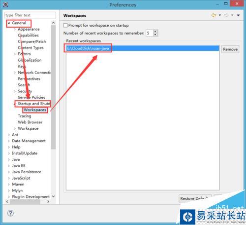 4、如果用以上方法還是沒有辦法添加,那就接著往下。首先查看eclipse的工作空間,如果知道工作空間就可以跳過此步。打開Window—>Preferences—>General—>Startup and Shutdown—>Workspaces就能看到你的工作空間了。