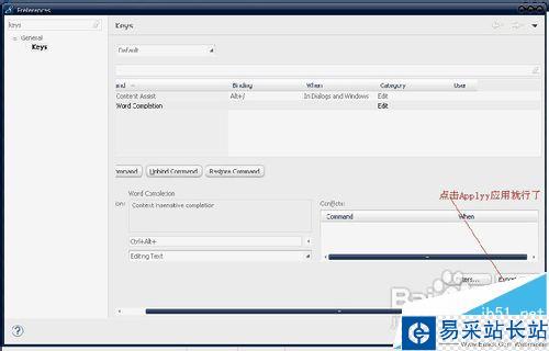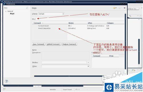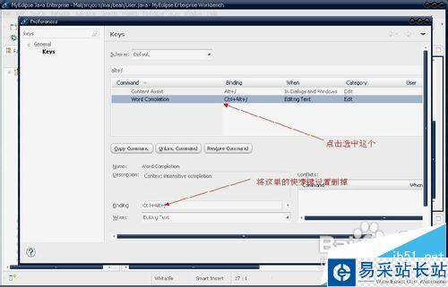 6、在這里我們將第二個去掉,Content Assist就是工具默認的快捷鍵。直接將wordCompletion刪除,先點擊wordCompletion,然后將下面的快捷鍵設置刪掉就行了。下面的就是設置如何將沖突的快捷鍵刪除。