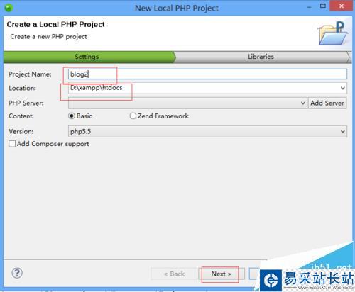 2、在彈出的新建向導,Project Name可以填你要導入的項目名稱或者另起一個,選擇工程存放路徑(一般選到web服務器下的www目錄,這樣調試運行也方便),好了后面直接下一步,直到完成。