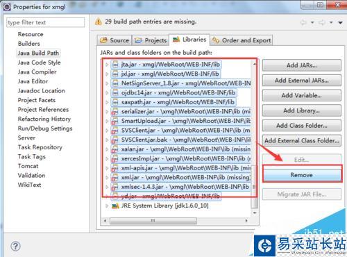 點擊eclipse項目的configure build path后,在彈出來的窗口中,找到Libraries頁簽,可以看到一些jar包是紅色叉號的,這種jar包就是找不到對應文件的jar包,引起這種eclipse項目前面出現紅色嘆號、eclipse項目前面出現紅色感嘆號、eclipse項目前面出現紅色驚嘆號、eclipse工程前面出現紅色嘆號的項目,可能是因為從外部導入的項目或者是因為某些文件被刪除了,才導致紅色嘆號、紅色感嘆號、紅色驚嘆號。找到這些eclipse項目中沒有的jar包,刪除它。