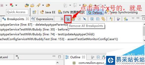 3、會看到一排圖標(biāo),一個X號的表示取消選擇的debug斷點(diǎn),兩個X號的是取消所有斷點(diǎn)。選擇兩個X號的,點(diǎn)擊。