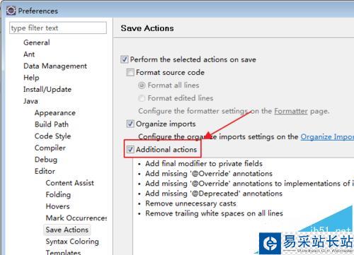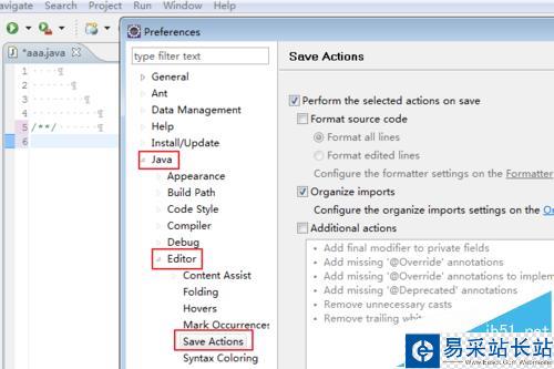 2、現在彈出的窗口就是JAVA開發人員常見的設置窗口了,我們依次點開【JAVA】>>【Editor】>>【Save Action】,最后把鼠標點擊在【Save Action】上