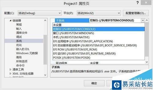 3、系統--->子系統(在窗口右邊)--->下拉框選擇控制臺(/SUBSYSTEM:CONSOLE)