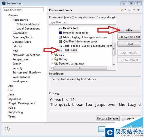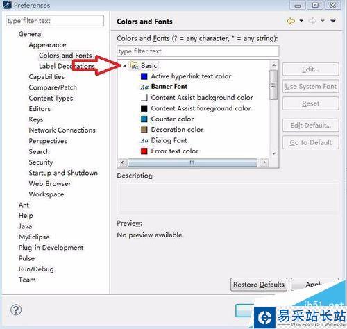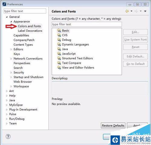 2、打開Preferences對話框后,依次選擇General-->Appearance-->Colors and Fonts,最后點擊Colors and Fonts