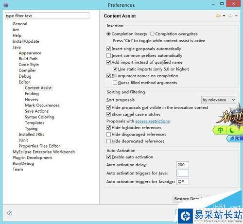 2、點擊java-editor-Content Assist 找到 Auto Activation triggers for java”這個選項。其實就是指觸發(fā)代碼提示的就是“.”這個符號。 吧它改成 .abc