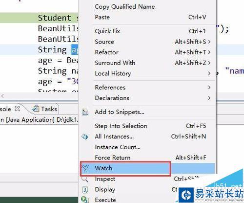 7、程序執行帶你的斷點出就不往下會執行了,好的這里我們要監視變量age的值了,選中age,右擊選擇watch