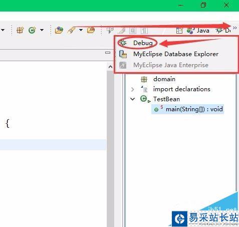 3、接著打開deBug模式,也就是調試模式中去。怎么切換到調試模式呢?在界面的最右邊,點擊這個【>>】出現彈出菜單--點擊【debug】。