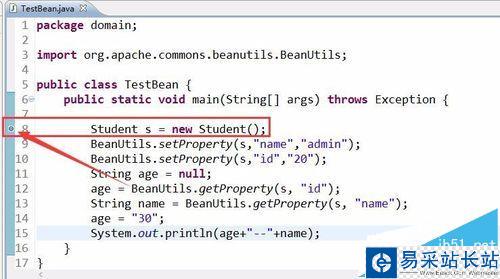 2、我就那這個程序來舉例吧。例如我現在要監視字符串age的變化。我們首先要下一個斷點。怎么下斷點,加入我現在要在第八行的位置下一個斷點,只需要在箭頭指向的位置,鼠標左鍵雙擊,出現一個小點就ok了