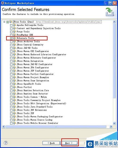 3、這里我們只需要“Hibernate Tools”,如下圖一步一步完成安裝。安裝完成后會(huì)彈出兩個(gè)對(duì)話(huà)框(忘記截圖了),點(diǎn)擊確認(rèn)即可,重新啟動(dòng)Eclipse。