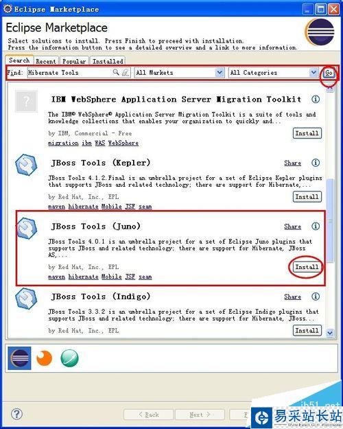 2、在搜索框中,輸入“Hibernate Tools” 點(diǎn)擊“Go”搜索,找到如下的一條記錄(Hiberntate Tools 是JBoss的一款工具),選擇“Install”安裝。