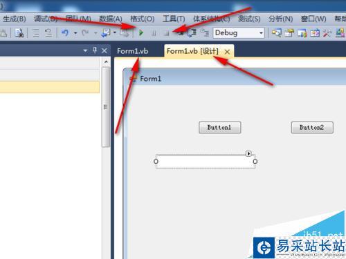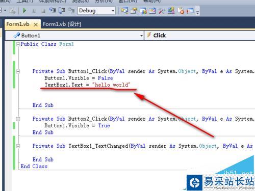 5、在窗體1中拖入一個文本框,默認命名為textbox1,給它的內容賦值“hello world”。保存文件。