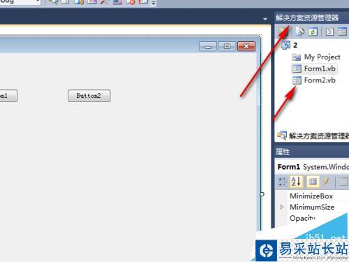 3、添加以后就可以在解決方案資源管理器里看到有兩個窗體了。在窗體1中拖入一個按鈕,雙擊,可以打開代碼窗體。