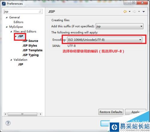 3、選擇【MyEclipse】—> 【Files and Editors】—>【JSP】,然后在窗口右邊點擊Encoding下拉列表,選擇你想要設置的默認編碼。最后點擊【ok】保存你的設置