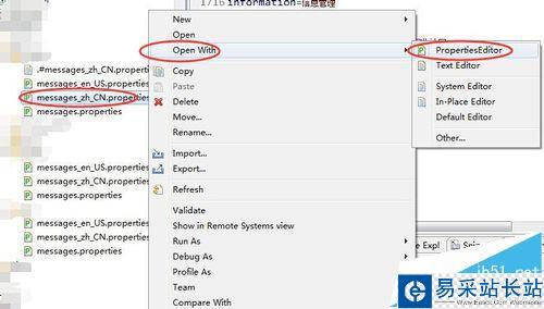 9、此時在properties文件上點右鍵,點擊“Open With"-"PropertiesEditor",打開文件,現在就可以直接輸入中文了。