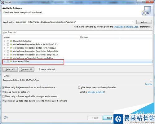 4、稍等兩分鐘,就會出現插件列表,選擇PropertiesEditor,然后Next.