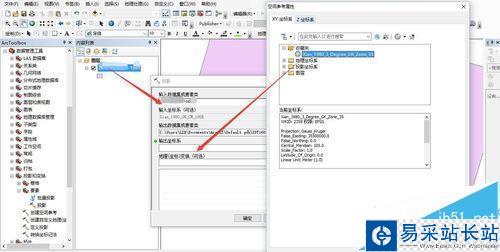 7、定義投影完成后即可進(jìn)行投影過(guò)程。在要素下選擇投影,選擇要投影的圖層,以及投影方式(這里的圖層中央精度為105度,所以選3 35)