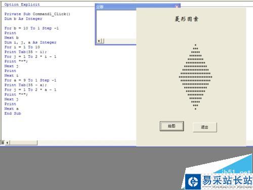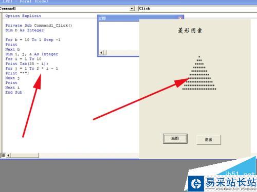 6、根據分析我們可以把菱形分成上下兩個三角形,首先繪制上部的三角形,輸入相應的代碼。點擊運行,如果有錯誤要進行修改,修改之后通過的圖案如下: