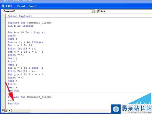 8、雙擊commmand2按鈕進入退出按鈕的代碼區域,由于該按鈕的功能是點擊之后退出程序,所以只要輸入end語句即可。