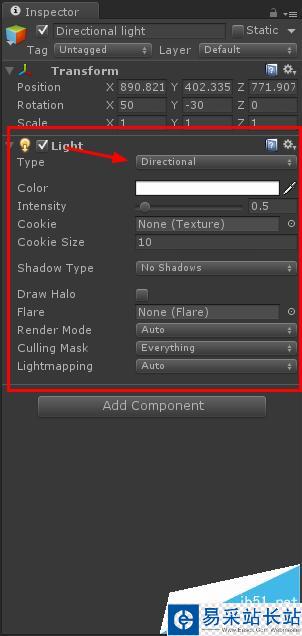 2、本文創建了一個平行光源。前面也說過,unity3d可以創建4種類型光源。在檢視面板,點擊紅框的選項,可以任意換光源類型。