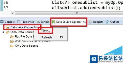 4、這時候,Eclipse主界面下方會多出一個“Data Source Explorer”標簽欄,在其中“Database Connections”文件夾圖標上單擊右鍵,選中“New...”。
