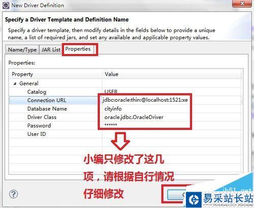 10、進入properties標簽欄,輸入自己所建數(shù)據(jù)庫相關(guān)內(nèi)容,小編在oracle中建的用戶名是“cityinfo”。這一步各自的信息可能不同,請自行決定。然后單擊“OK”。