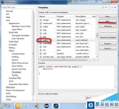 6、更改Java模板:在”Preferences"對(duì)話(huà)框中找到自己想要更改的標(biāo)簽名稱(chēng),例圖中的”main”方法,單擊“Edit"按鈕.