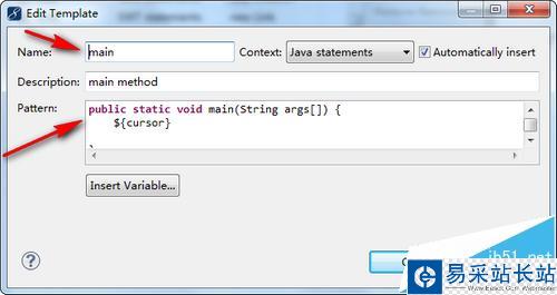 7、更改Java模板2:在彈出的“Edit Template"對(duì)話(huà)框,找到”Pattern"標(biāo)簽,在文本庫(kù)中可以更改成自定義的樣子。