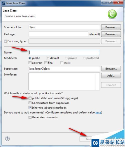 4、創(chuàng)建類(lèi)的名稱(chēng):在彈出的“New Java Class"對(duì)話(huà)框中,找到”Name:"標(biāo)簽,在后面的文本框中輸入自定義的名稱(chēng),例如圖中的"a".其它默認(rèn).也可以勾選“public static void main(String[] args)選項(xiàng)卡,可以生成main()方法。單擊"Finish"即可。