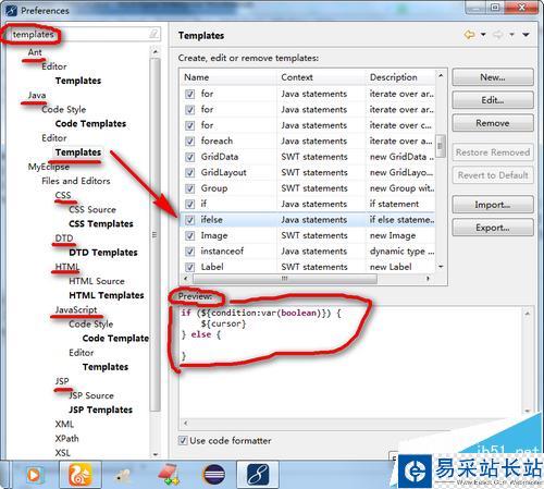5、找到Java 模板(Templates):單擊菜單欄中的"Windows-Preferences"。會(huì)彈出”Preferences"對(duì)話(huà)框,在“搜索項(xiàng)”里輸入“templates",會(huì)自動(dòng)列出MyEclipse的各種模板(JAVA.CSS.DTD.HTML.JavaScript.JSP.Java注釋模板(僅供參考))。這里僅做個(gè)示范。還可以在”Preferences"對(duì)話(huà)框,單擊-Java-Editor-Templates,跟上面的效果一樣。