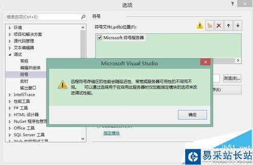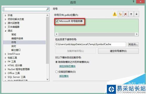 3、然后展開“調試”-“符號”,勾選“Windows符號服務器”。