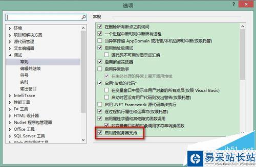 2、在選項窗口中,展開“調試”-“常規(guī)”,然后在右邊的窗格中勾選“啟用源服務器支持”。