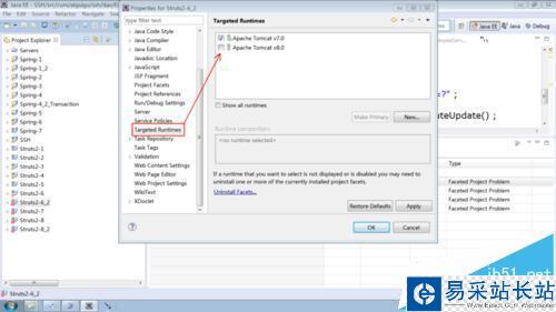 1、右鍵點擊【工程名】 → 【Properties】→ 【Targeted Runtimes】→ tomcat7.0的去掉對勾,tomcat8.0的打對勾。→ 【Apply】→ 【OK】,因為我的機子上安裝的是Tomcat8.0,所以要去掉上者,選中下者。