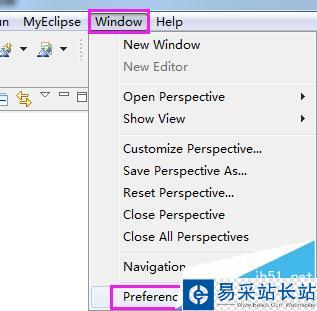 2、打開MyEclipse,點擊工具欄上的window --> preferences選項,如圖所示。