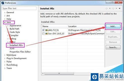3、在打開的頁面點擊 Java --> Installed JREs ,然后點擊Add按鈕。如圖所示。