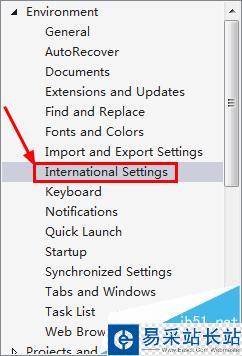 6、選擇最左邊的環境(environment)下的國際設置(international setting)。