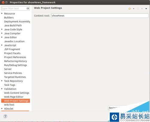 3、找到下面的Web Project Setting,注意看這里的Context root是不是你的項目名稱,比如我的就還是之前的項目名:showNews