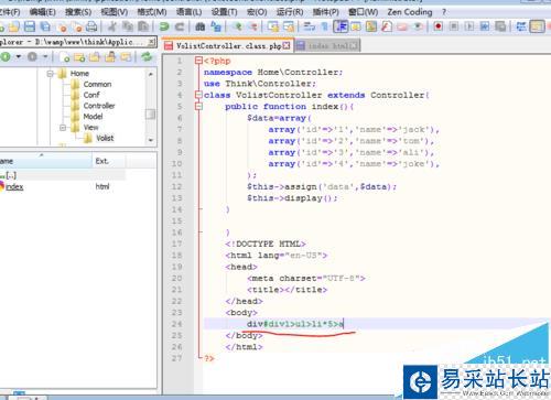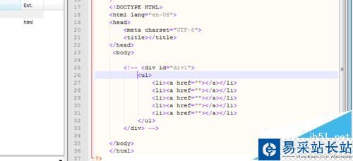 5、在比如,要想在里面輸入幾個(gè)樣式塊可以輸入div#div1>ul>li*5>a一行 就省去了7行代碼的輸入