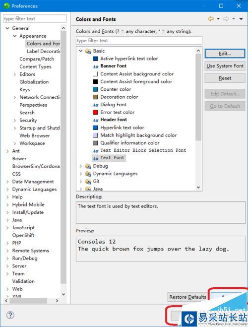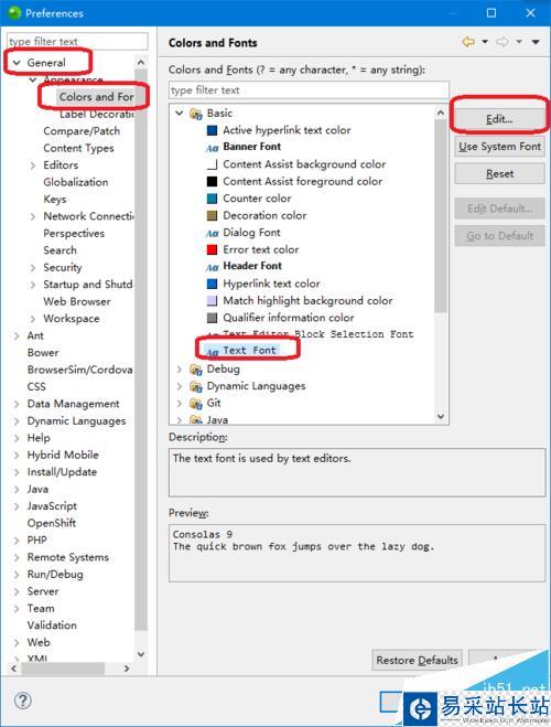 3、單擊“General”→“Appearance”→“Color and Fonts”→“Basic”→“Text Fonts”→“Edit”。