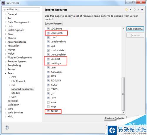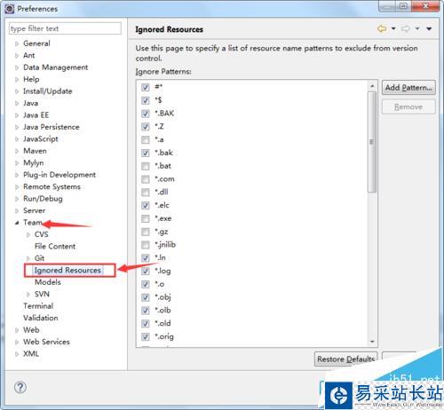 2、在彈出的對話框中找到Team提交選項下邊的Ignored Resources。