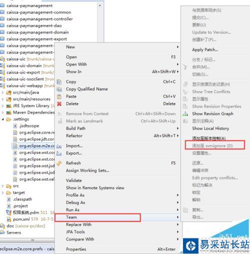 1、還有一種方法,直接在需要忽略的文件右鍵選中team選項,選擇添加至 svn:ignore即可,如圖: