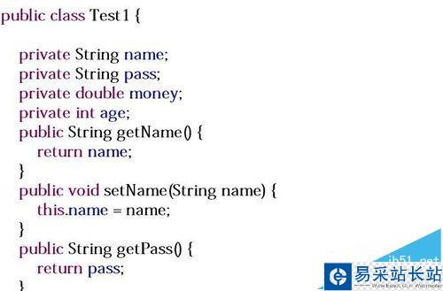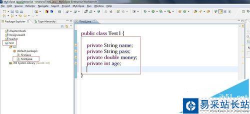 2、創建工程,Java文件,在文件中編寫屬性,我這里是Test工程,test1的Java文件,屬性有name,pass,money和age屬性