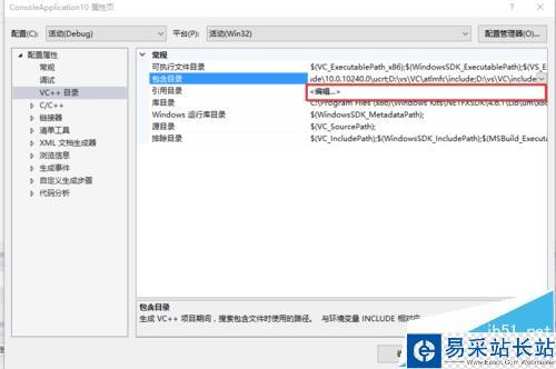 2、在打開的選項卡中選擇vc++目錄-->包含目錄下拉條點(diǎn)擊編輯