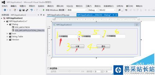 4、對上面的對話框進行編輯,如下圖中所示,最后編輯的樣子如下,其中1,5,6是Edit 控件,2,7是靜態(tài)控件,3是buttion,4是取消按鈕改了個名字,將各個控件按下圖排好,并改好名字,其余部分采用軟件默認
