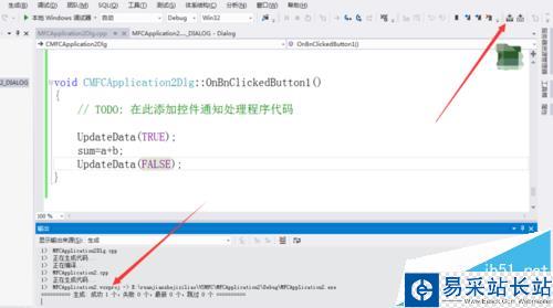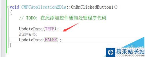 8、在這個函數(shù)中添加下面代碼,UpdataDate()函數(shù)中參數(shù)true表示從控件變量中獲取數(shù)值,false相反sum=a+b,就是我們先在控件中添加的三個變量,此處所做的計算器只是用來做個加法