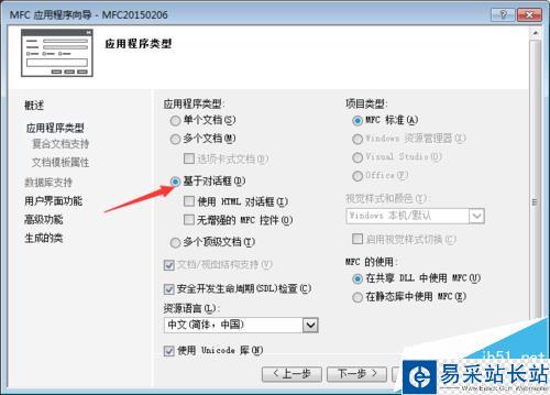 2、建立基于對話框的標準程序,如下圖所示,其余設置采用系統(tǒng)設置,點擊完成