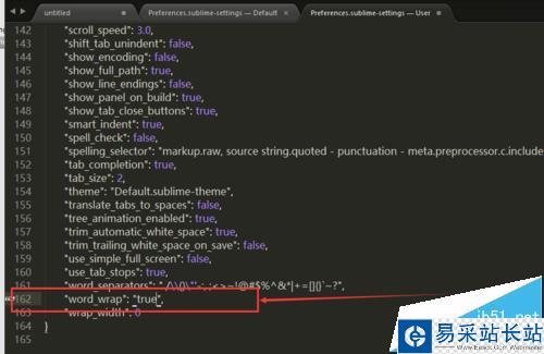 3、打開用戶配置選項文件,操作:菜單Preferens --> Settings User,同時查找“word_wrap”選項確認該選項是否存在,如果用戶配置中無任何配置項,則直接將所有的配置項從默認配置項中拷貝過來(系統默認配置項參考第二步驟,默認配置選項是不可更改的),然后找到“word_wrap”選項,將值設置為true。