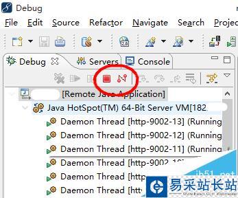 6、在如圖所示的debug模式里。有這兩個紅色按鈕,一個是“停止”,另一個是“斷開連接”,圖標已經很形象了,點擊“斷開連接”或者“停止”之后,就可以斷開遠程調試了