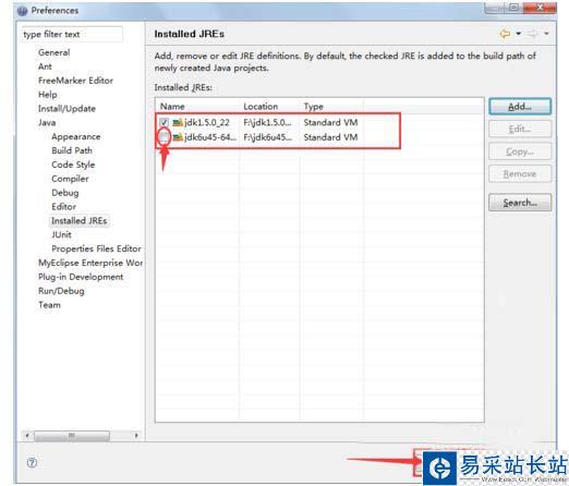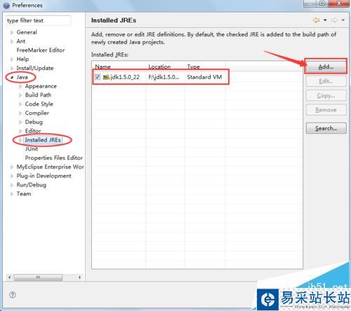 2、在Preferences窗口中,點(diǎn)開Java的下拉列表,找到并選中 Installed JREs,并點(diǎn)擊右邊的 Add... 按鈕。如圖,從圖中可以看出,小編電腦上已經(jīng)裝了jdk1.5,下面我們將繼續(xù)添加并更換成jdk1.6
