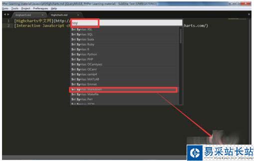 3、編輯Markdown文件。按Ctrl + N 新建一個文檔按Ctrl + Shift + P使用Markdown語法編輯文檔語法高亮,輸入ssm 后回車(Set Syntax: Markdown)編寫完保存以.md為后綴的文件。