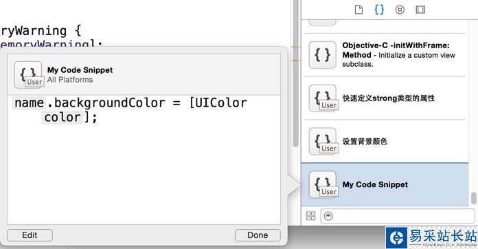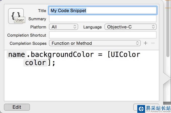 “Title”是這個代碼塊的標題,可以簡單寫幾個字,比如“設置背景顏色”;“Summary”是一個概括描述,可以不填;“Platform”中設置此代碼塊的作用的平臺(All/iOS/OS X/watchOS);“Language”是對應的語言,有很多中可以選擇;“Completion Shortcut”是此段代碼塊的快捷代碼,在編寫代碼時只要打出快捷代碼就可以直接使用這個代碼塊,比如設置背景顏色的代碼可以填寫“bgcolor”;“Completion Scopes”是該代碼塊的生效區域,可以默認。填寫完畢后點擊“Done”即可。